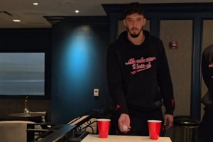 曼联球员们进行掷球比拼,将乒乓球投入杯子中,齐尔克泽展现了惊人的准确度。